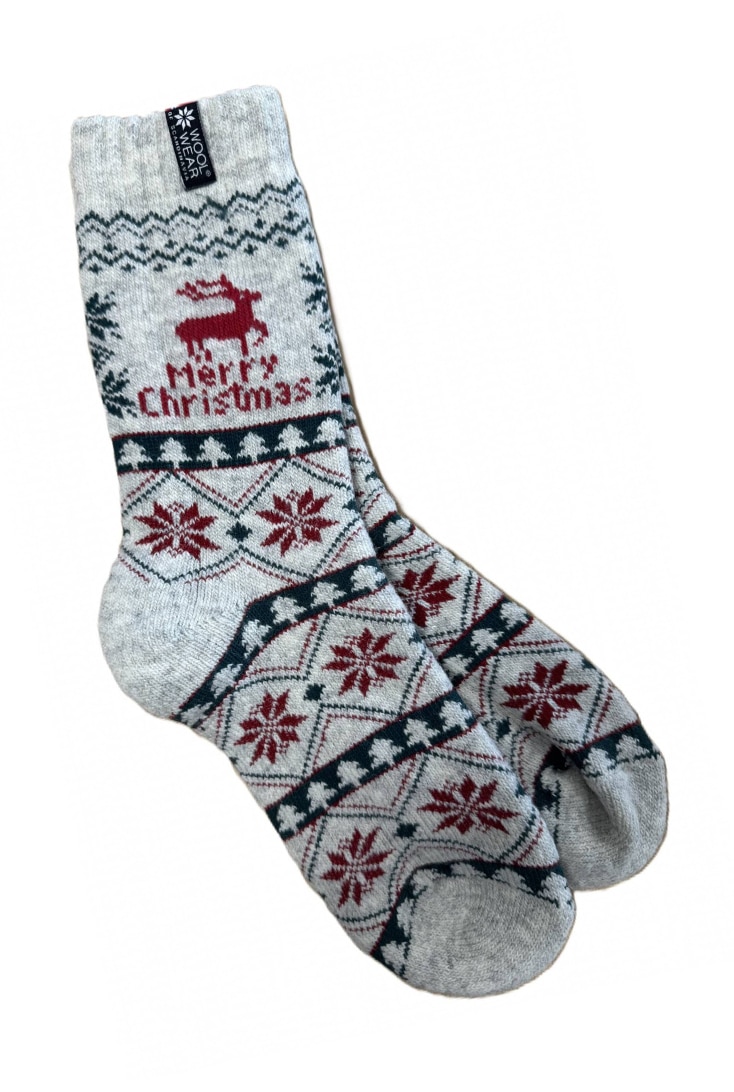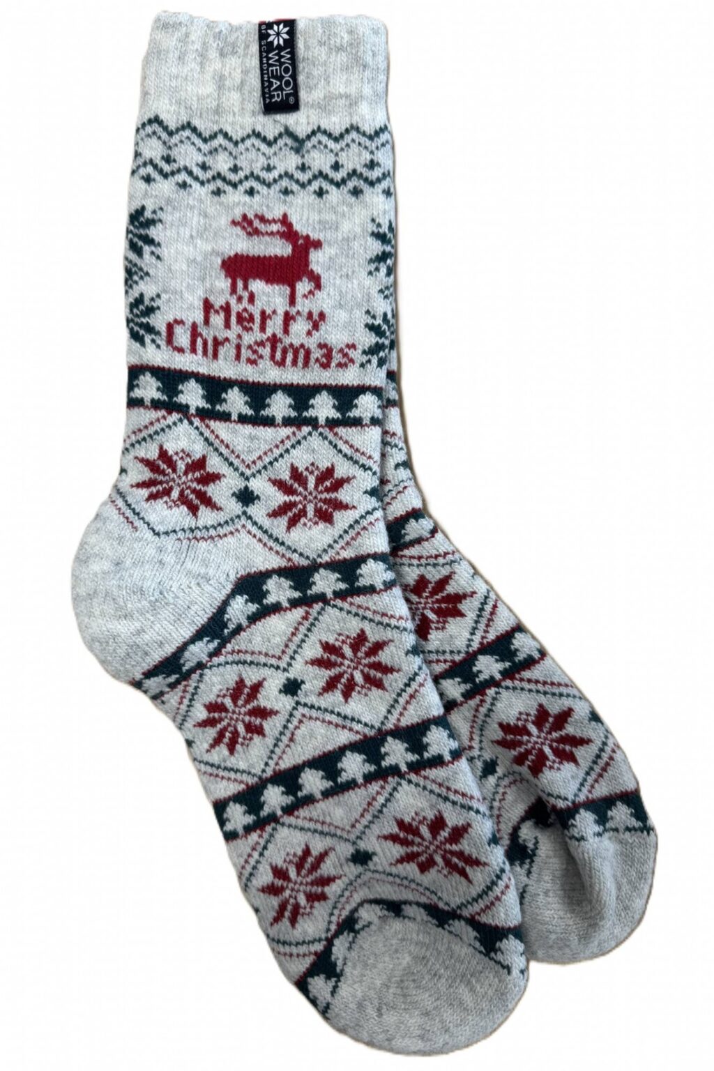 Bløde lækre uldsokker med teksten “Merry Christmas” og det sødeste rensdyr.