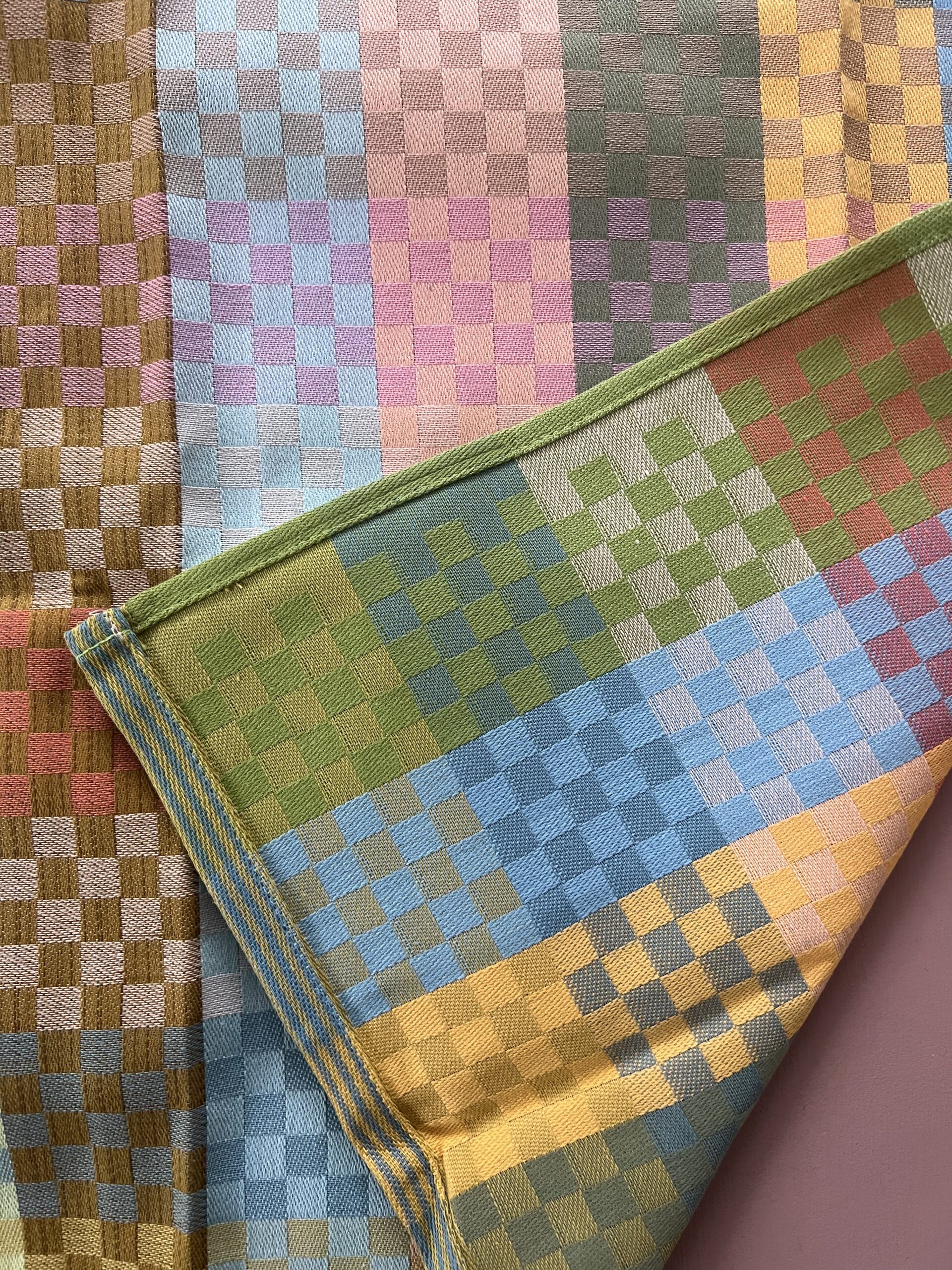 Viskestykket har et skønt ternet design, som dannes når de mange forskellige farvede tråde væves over hinanden – et design som er overraskende, harmonisk og helt specielt.